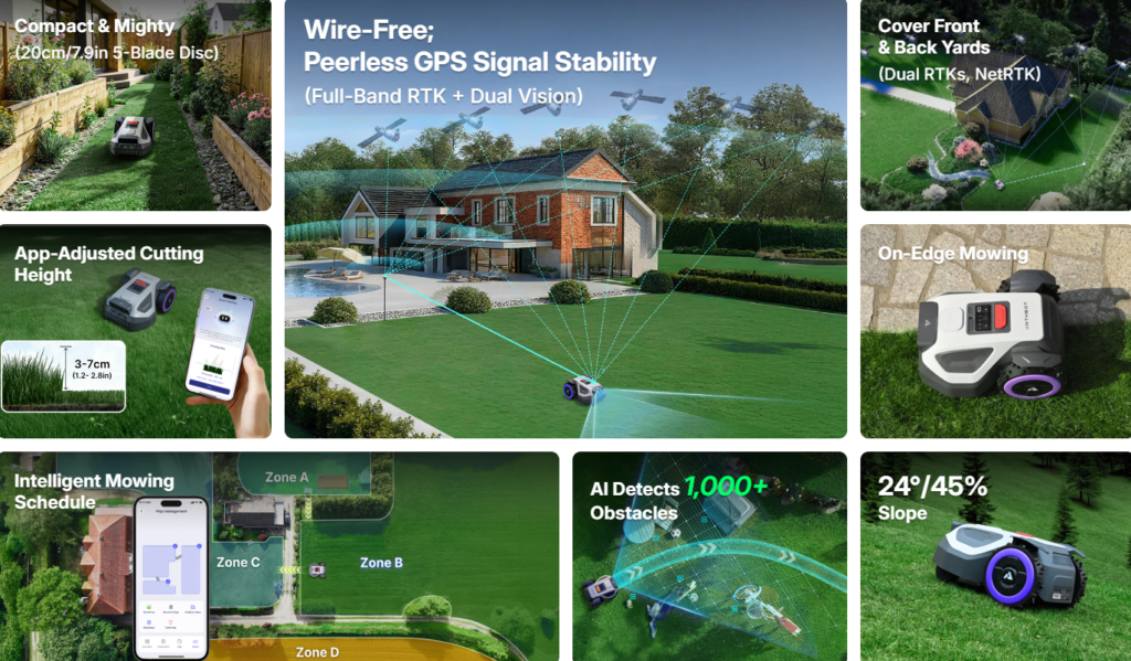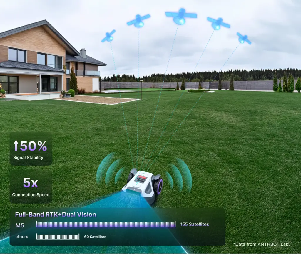 Anthbot M5 wykorzystuje zaawansowany system pozycjonowania kinematycznego czasu rzeczywistego (RTK), wspierany przez moduł wizyjny. Ta synergia pozwala na utrzymanie centymetrowej dokładności nawet w dynamicznych warunkach środowiskowych. W przeciwieństwie do tradycyjnych rozwiązań, model M5 nie wymaga żmudnej instalacji kabla ograniczającego – wirtualna mapa ogrodu powstaje w procesie cyfrowej synchronizacji, co pozwala na pełne wdrożenie systemu w mniej niż 10 minut.