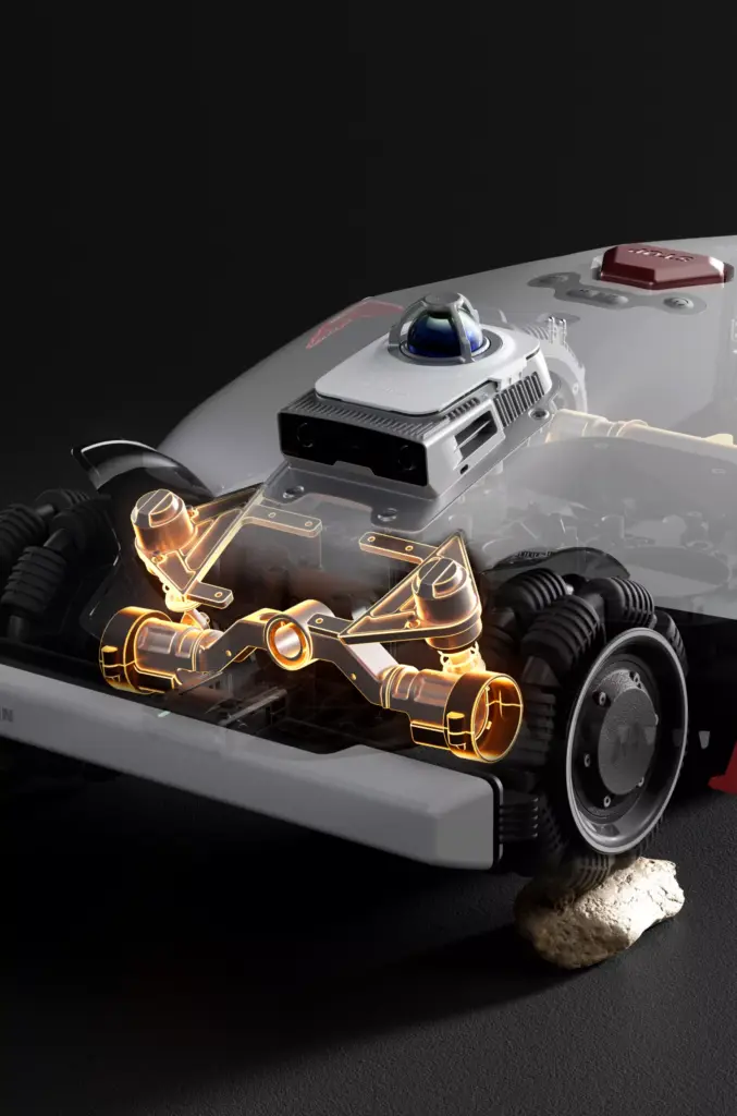 Dodatkowy system zawieszenia stabilizuje robot podczas pracy, utrzymując równą wysokość koszenia.